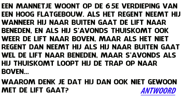 Als hij dan in de lift op zijn tenen gaat staan, dan kan hij net met de punt van zijn paraplu bij het knopje van de 65e verdieping.